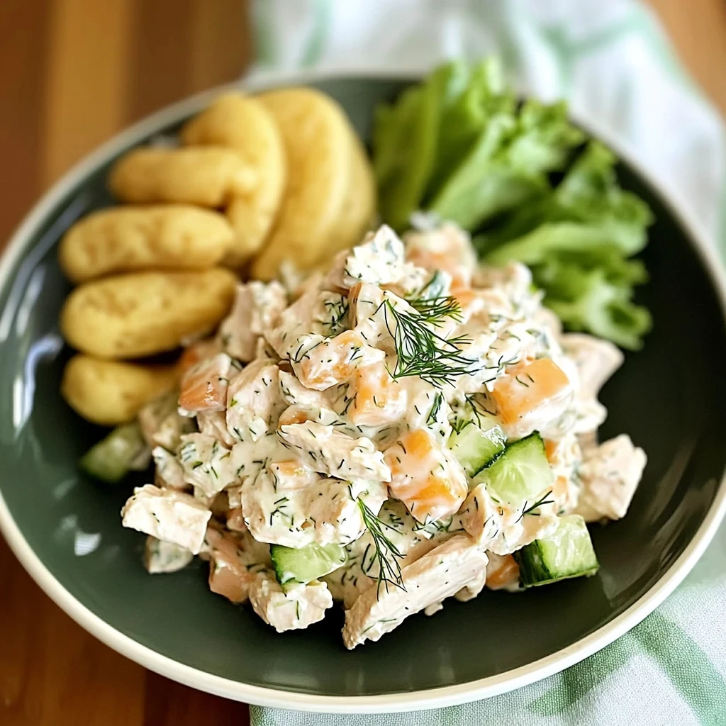 Dill chicken salad is a quick and healthy meal option perfect for lunch or as a light dinner. With just 15 minutes of prep time and no cooking involved, this dish is ideal for busy weekdays. It serves four and combines tender chicken with fresh vegetables and a creamy dressing.