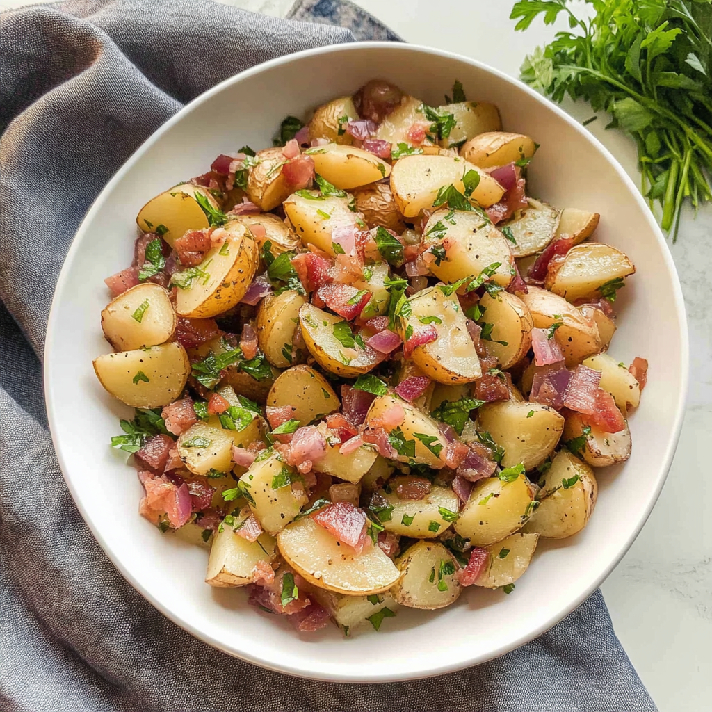 4. In a large mixing bowl, combine warm potatoes, crispy bacon, and diced red onion. Pour the dressing over and toss gently until well coated.