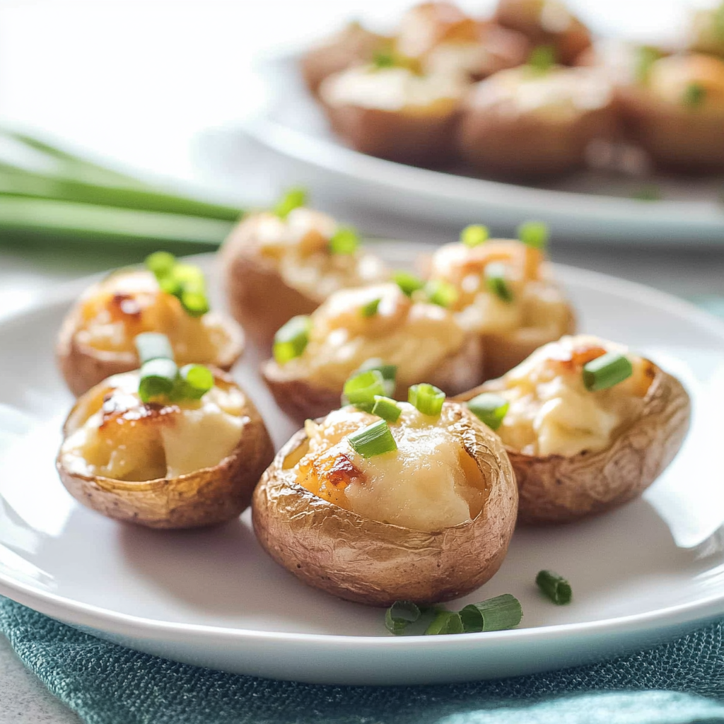 Mini Twice Baked Potatoes are a delightful appetizer or side dish made from small, tender potatoes. They are first baked until soft, then scooped out and mixed with ingredients like cheese, sour cream, and herbs. After mixing, the filling is returned to the potato skins and baked again until golden and crispy. perfect side for chicken dishes This twice-baking process enhances the flavor and texture, making them irresistible. These bite-sized treats are perfect for parties or as a fun family meal.