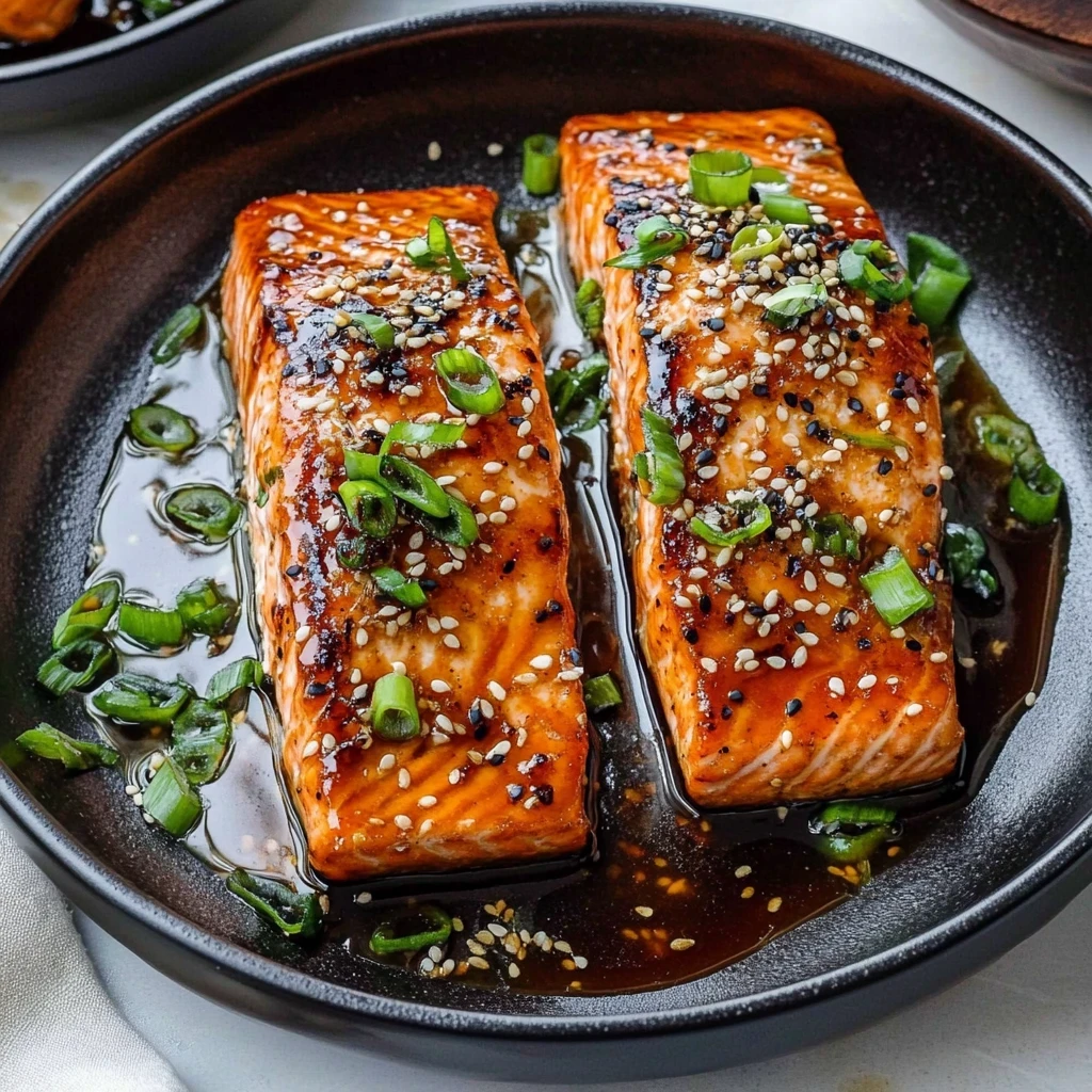 Bake the salmon in the preheated oven for 12-15 minutes or until cooked through and flaky when tested with a fork. Once done, remove it from the oven and allow it to rest for a couple of minutes before serving. For garnish, sprinkle chopped green onions over each fillet just before serving.