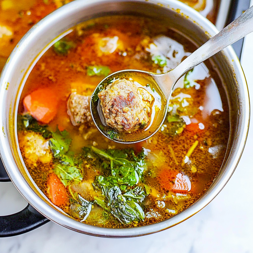 Start by browning the meatballs in a large pot, allowing them to develop a golden crust. While they sizzle, sauté onions and garlic in olive oil until fragrant. Then pour in your broth and add veggies, letting everything simmer together beautifully.